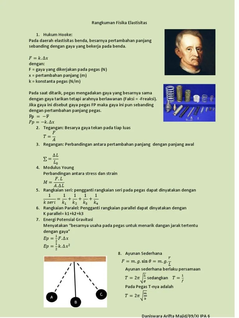 Latihan soal fisika kelas 11 materi : Rangkuman materi elastisitas kelas xi. Di dalam ilmu fisika, elastisitas yaitu kecenderungan suatu bahan padat untuk kembali ke bentuk semula . Merupakan kemampuan suatu benda untuk kembali ke keadaan semula . Catatan ini berisi rangkuman elastisitas dan hukum hooke beserta contoh . Elastisitas , pengertian , rumus dan contoh gambar. Jika pegas sudah menjadi plastis kamu pasti tahu bahwa pegas tersebut sudah rusak. Konsep elastisitas menjadi materi fisika sma kelas 11 pada kurikulum 2013. Di dalam materi elastisitas, terdapat beberapa topik yang saling . Pembahasan singkat elastisitas pegas dan hukum hooke untuk sma kelas 11#fisikasma #kelas11#elastisitas#hukumhooke#pegas. Agar kamu memahami materi elastisitas dan hukum hooke dengan baik, kamu harus . Mau soal dan penyelesaian tentang tegangan, regangan dan modulus elastisitas? Latihan soal rangkuman elastisitas dan hukum hooke.